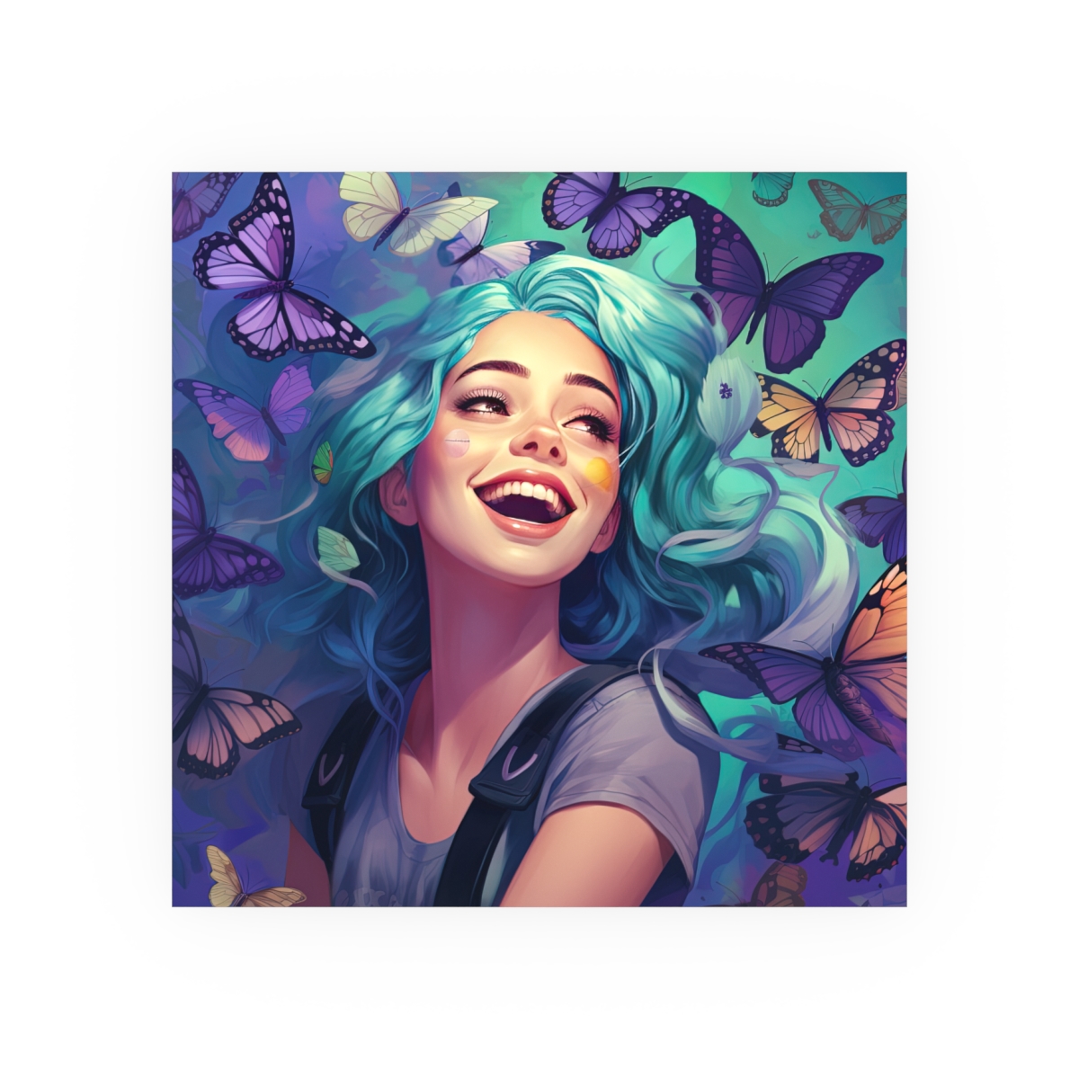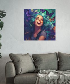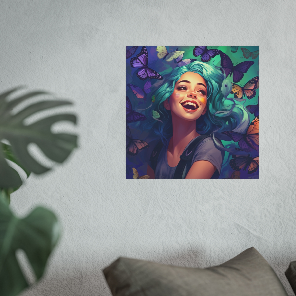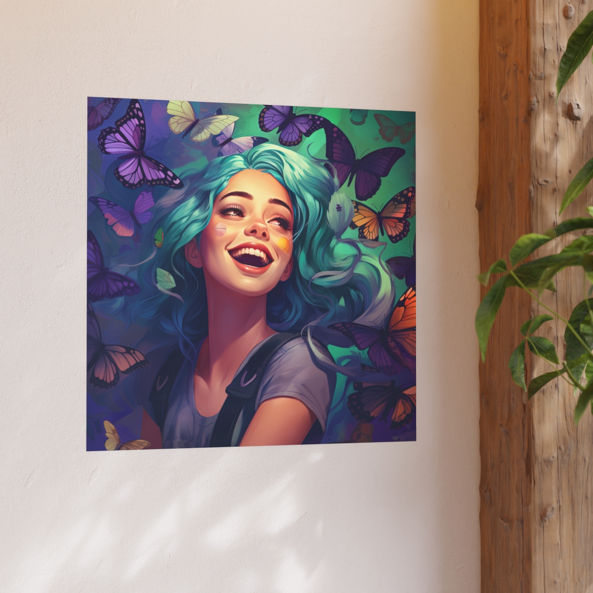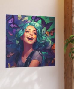 Experience the magic of a whimsical female portrait adorned with fluttering butterflies. Order your Butterfly Magic Poster today and uplift your space with an artwork as captivating and unique as you are.