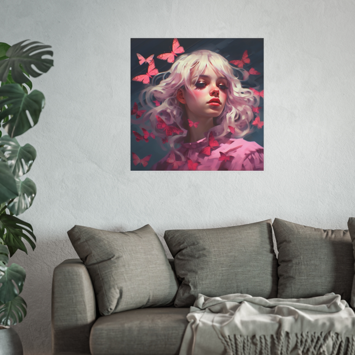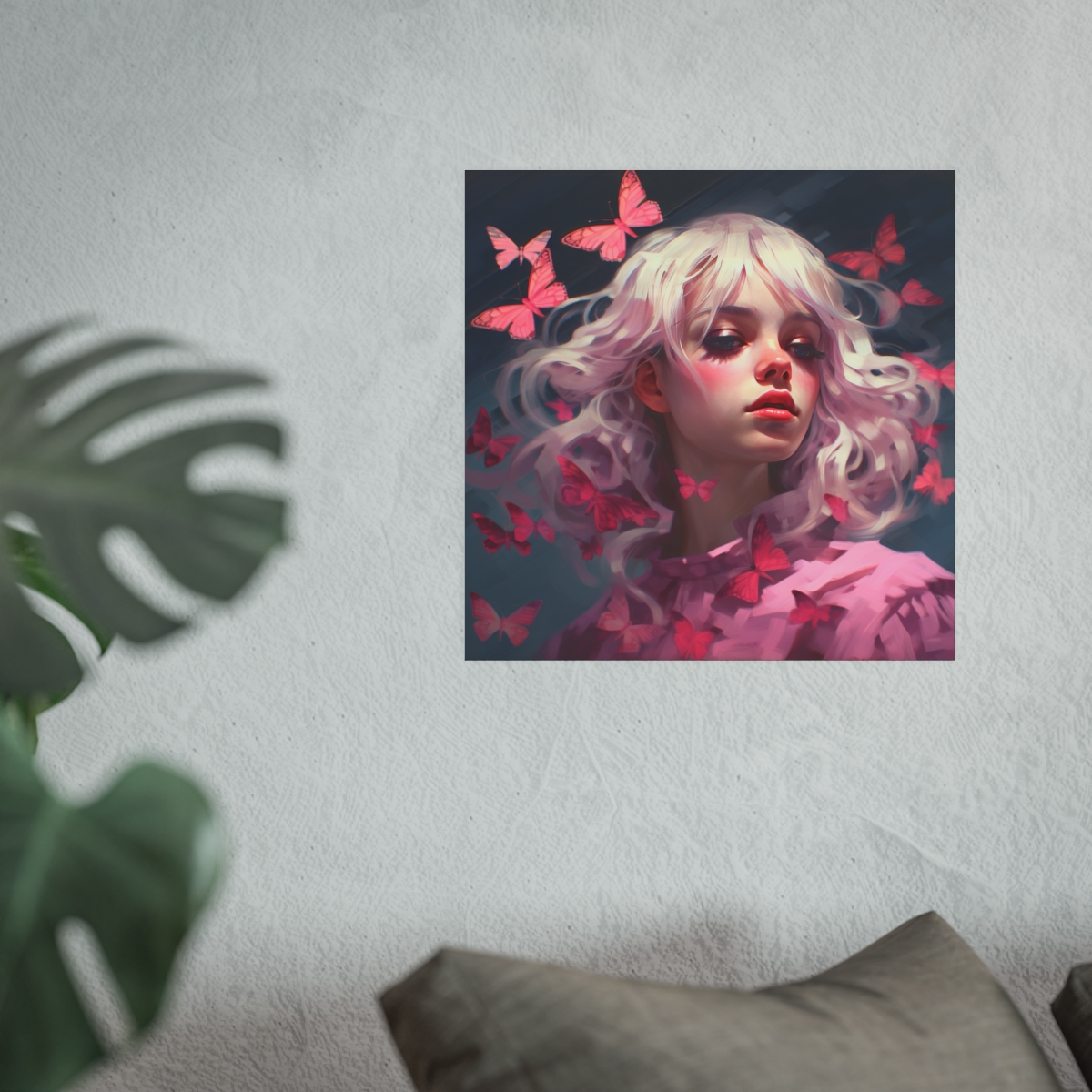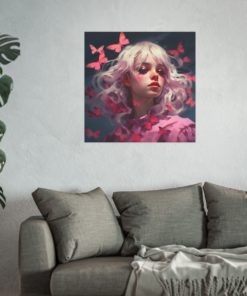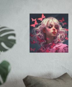 Our Butterfly Magic Portrait isn’t just another painting; it’s a dive into the realm of modern artistry. This captivating portrait is bursting with vibrant shades and playful patterns, reminiscent of a young woman’s vivacity and charm. From the delicate contours of the woman’s features to the flighty, whimsical butterflies that surround her, every element immerses you in a world of color and imagination. The artist has skillfully captured the lively spirit and radiant beauty of the young woman, blending it seamlessly with the delightful flutter of the butterflies. This piece seamlessly bridges the gap between contemporary charm and timeless elegance, making it an exquisite choice for art lovers.