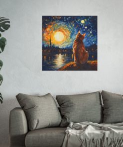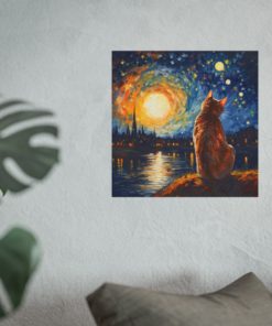 Introducing our mesmerizing tribute to Vincent van Gogh’s Starry Night featuring the noble cat– a harmonious fusion of iconic artistry and imaginative allure. This enchanting piece showcases a charming Calico Cat, bathed in the swirling blues and yellows reminiscent of Van Gogh’s masterpiece. With detailed brushwork and a dreamy ambiance, this print transforms any room into an artistic haven. Printed on luxurious fine art paper, it offers a refined touch that is bound to enchant and awe visitors and art enthusiasts alike.