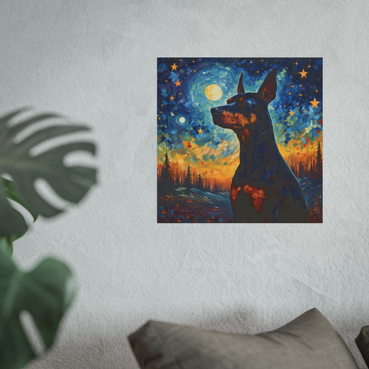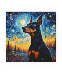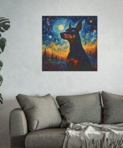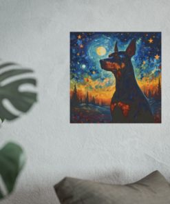 Introducing our mesmerizing tribute to Vincent van Gogh’s Starry Night featuring the noble cat– a harmonious fusion of iconic artistry and imaginative allure. This enchanting piece showcases a stoic Doberman Pinscher, bathed in the swirling blues and yellows reminiscent of Van Gogh’s masterpiece. With detailed brushwork and a dreamy ambiance, this print transforms any room into an artistic haven. Printed on luxurious fine art paper, it offers a refined touch that is bound to enchant and awe visitors and art enthusiasts alike.