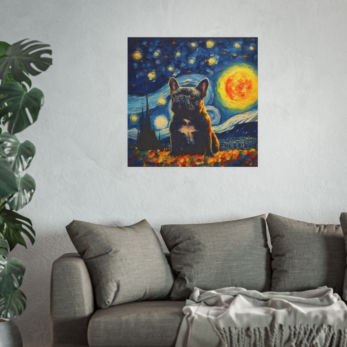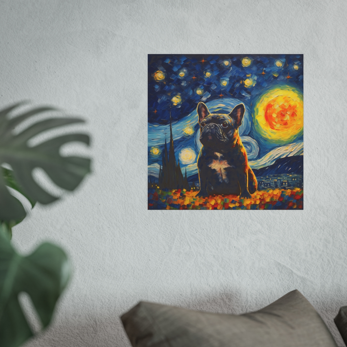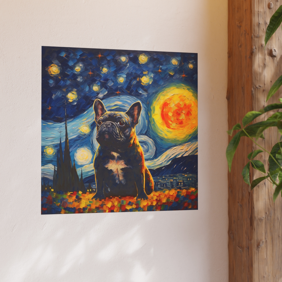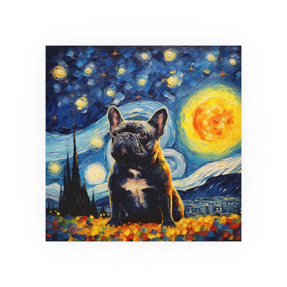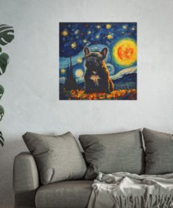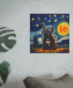 Introducing our mesmerizing tribute to Vincent van Gogh’s Starry Night featuring the noble cat– a harmonious fusion of iconic artistry and imaginative allure. This enchanting piece showcases a charming Tuxedo French Bulldog, bathed in the swirling blues and yellows reminiscent of Van Gogh’s masterpiece. With detailed brushwork and a dreamy ambiance, this print transforms any room into an artistic haven. Printed on luxurious fine art paper, it offers a refined touch that is bound to enchant and awe visitors and art enthusiasts alike.