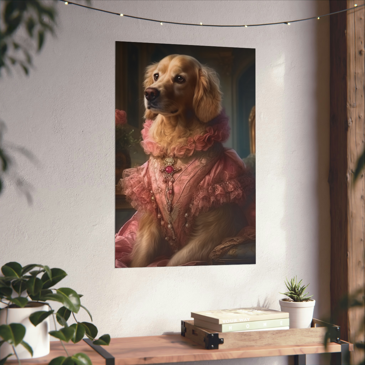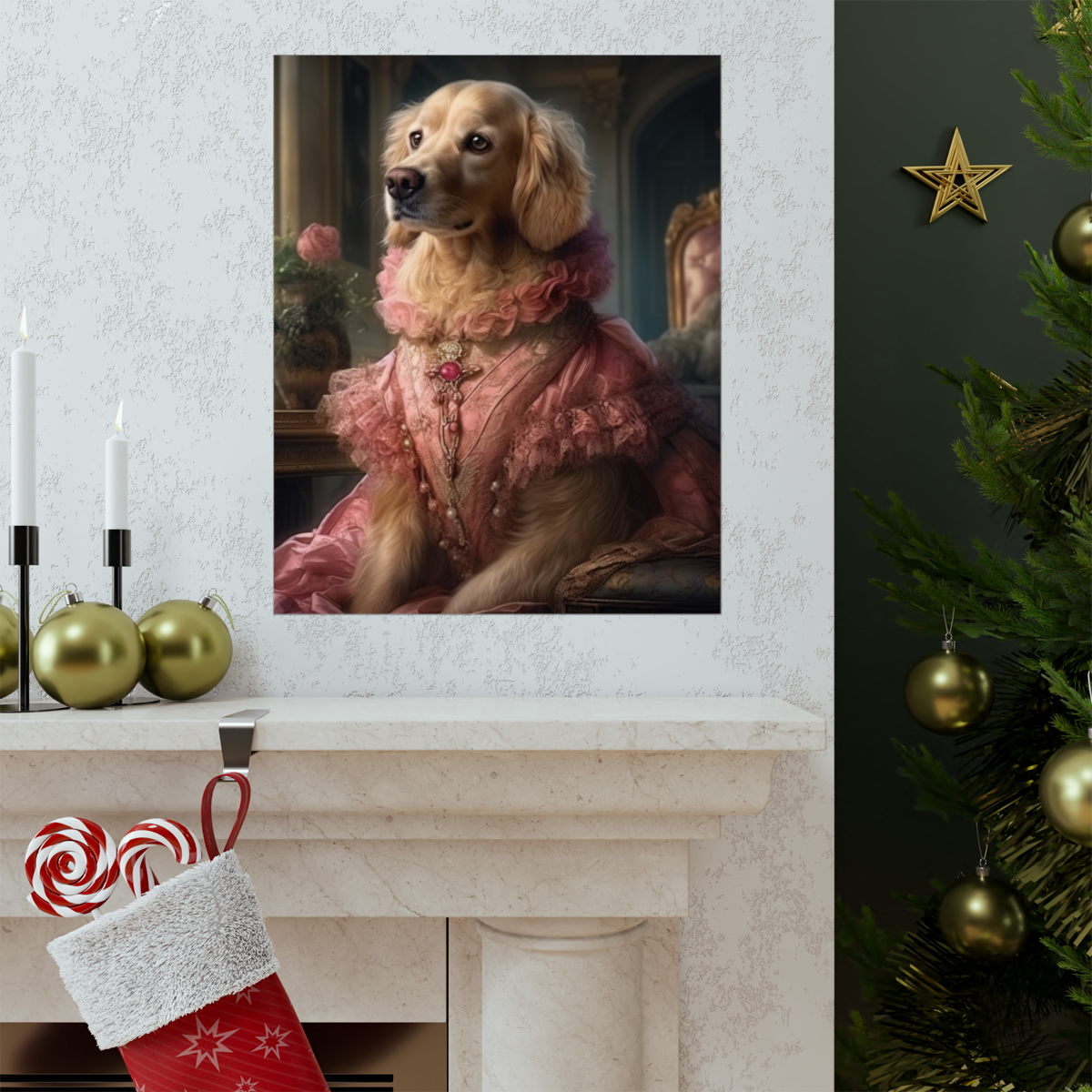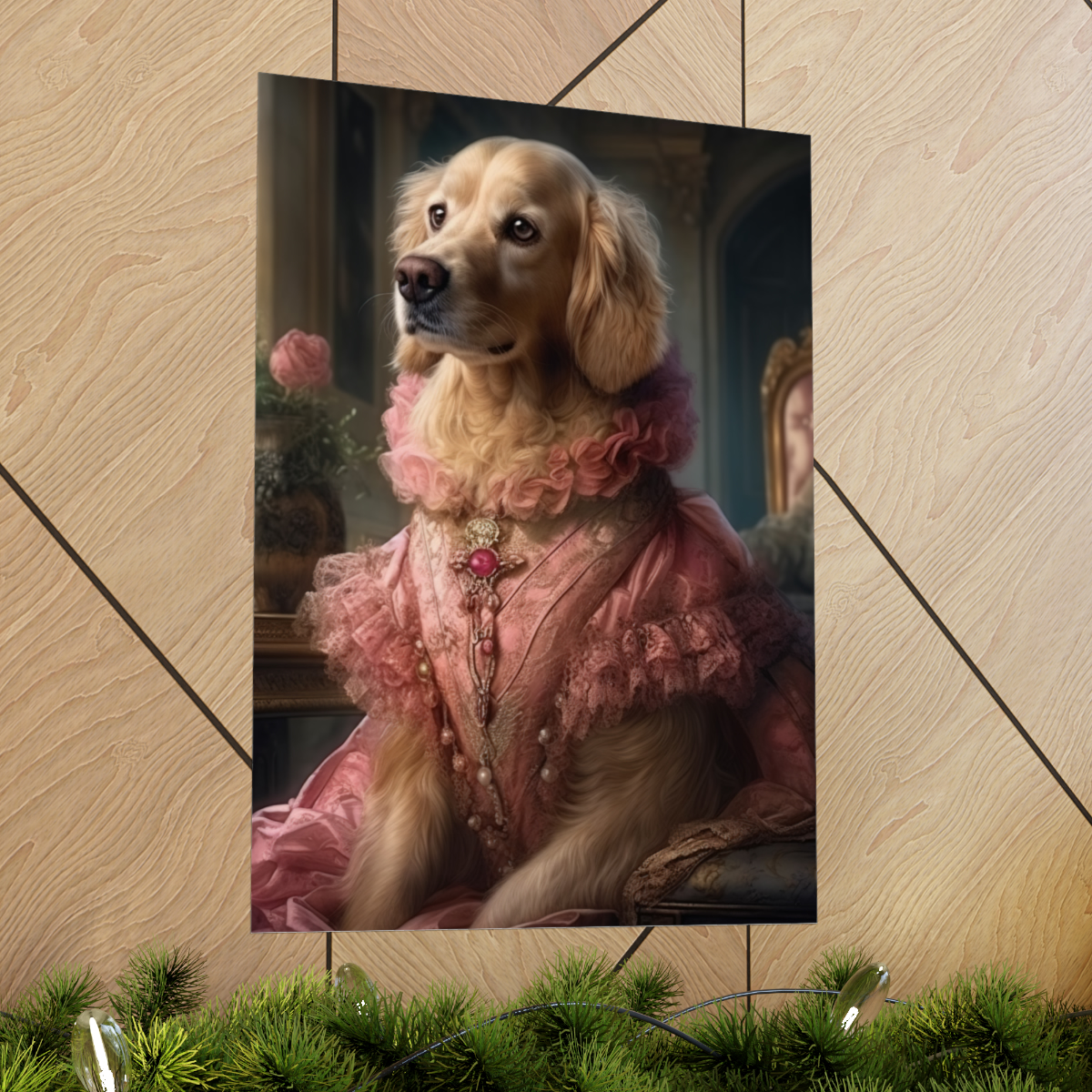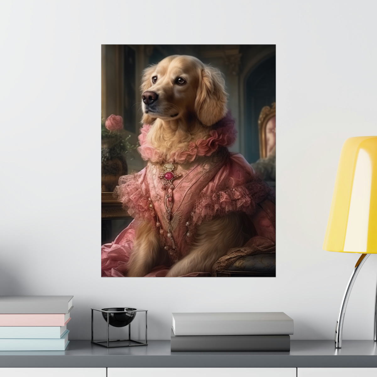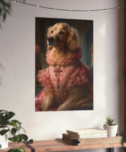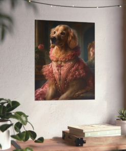 Introducing our captivating Rococo take on the noble dog – a unique blend of classic artistry and whimsical charm. This delightful piece showcases a charming Golden Retriever, dressed to the nines in authentic 18th century French Rococo fashion. With intricate detailing and a playful demeanor, this print effortlessly turns any space into an artful sanctuary. Printed on luxurious matte 175gsm fine art paper, it adds a sophisticated touch that is sure to captivate and impress visitors and art lovers alike.