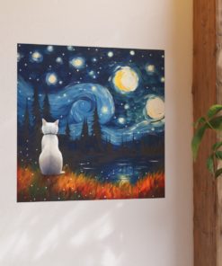 Introducing our mesmerizing tribute to Vincent van Gogh’s Starry Night featuring the noble cat– a harmonious fusion of iconic artistry and imaginative allure. This enchanting piece showcases a charming White Cat, bathed in the swirling blues and yellows reminiscent of Van Gogh’s masterpiece. With detailed brushwork and a dreamy ambiance, this print transforms any room into an artistic haven. Printed on luxurious fine art paper, it offers a refined touch that is bound to enchant and awe visitors and art enthusiasts alike.